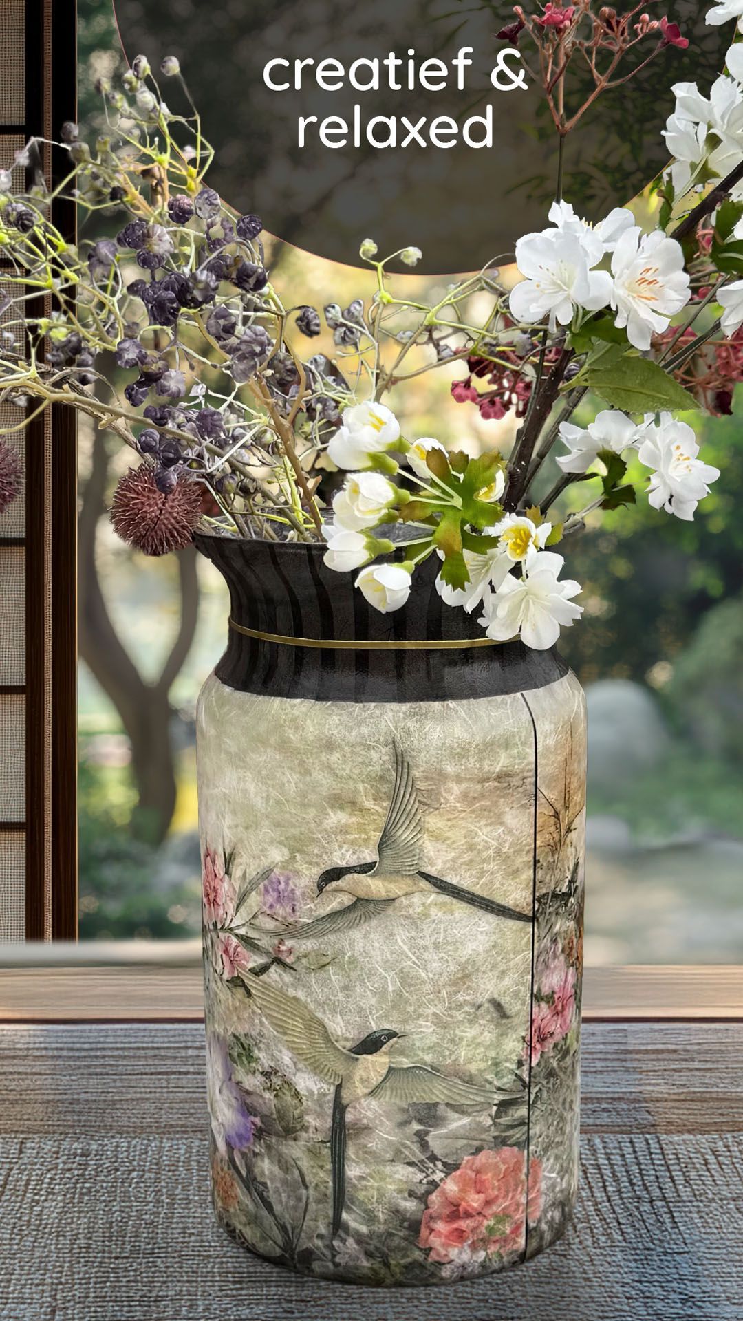 Omdat het papier op de buitenkant zit, kun je gewoon water in de vaas doen en er een mooi boeket bloemen in zetten. Of zet er een paar takken kunstbloemen in, ook heel mooi.