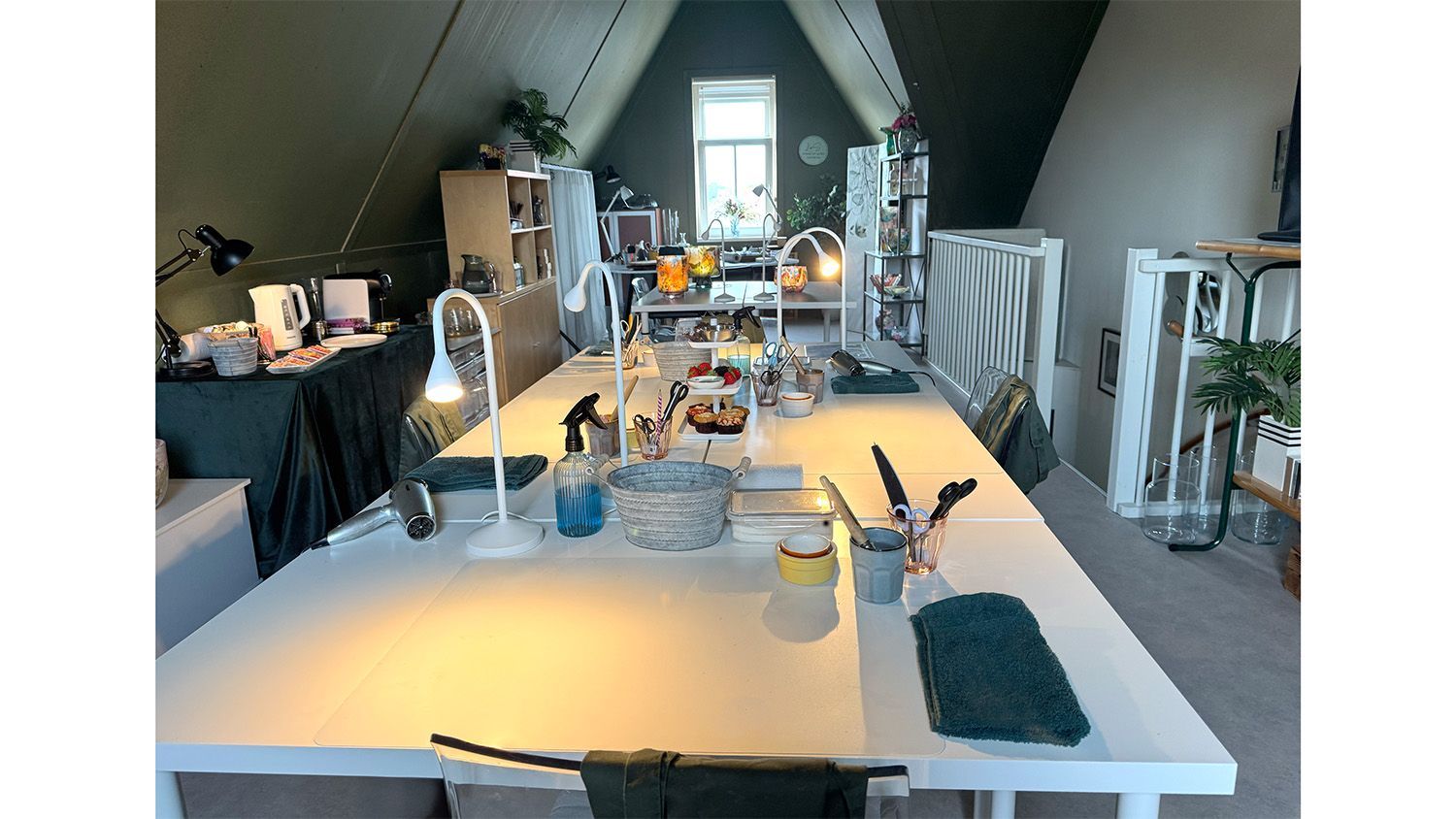 Het ruime atelier is ingericht met comfortabele werkplekken.